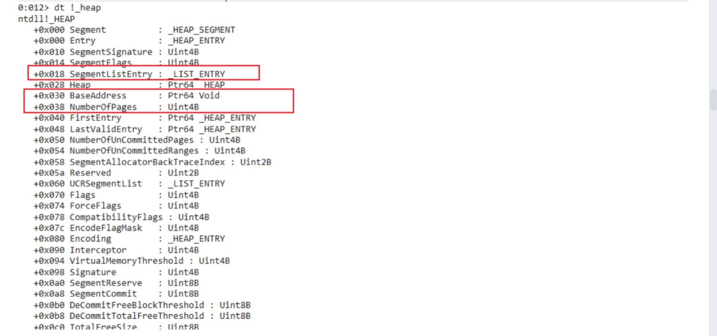 但是在_HEAP_SEGMENT当中,只有FirstEntry和LastValidEntry,这两个字段的含义是指向第一个以及最后一个堆块