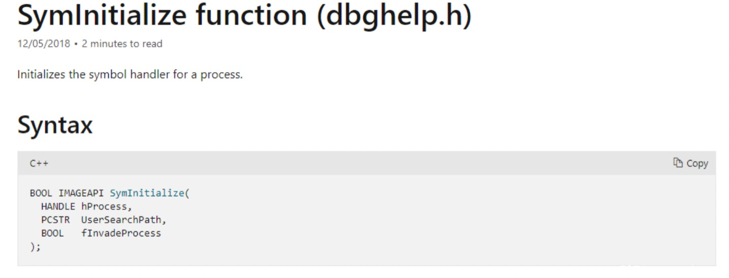 根据官方文档的描述,SymInitialize的作用是用来初始化进程符号句柄的