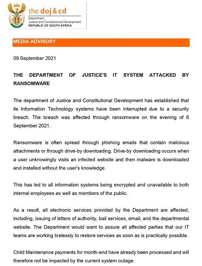 4、南非司法部网络系统遭到黑客攻击陷入瘫痪