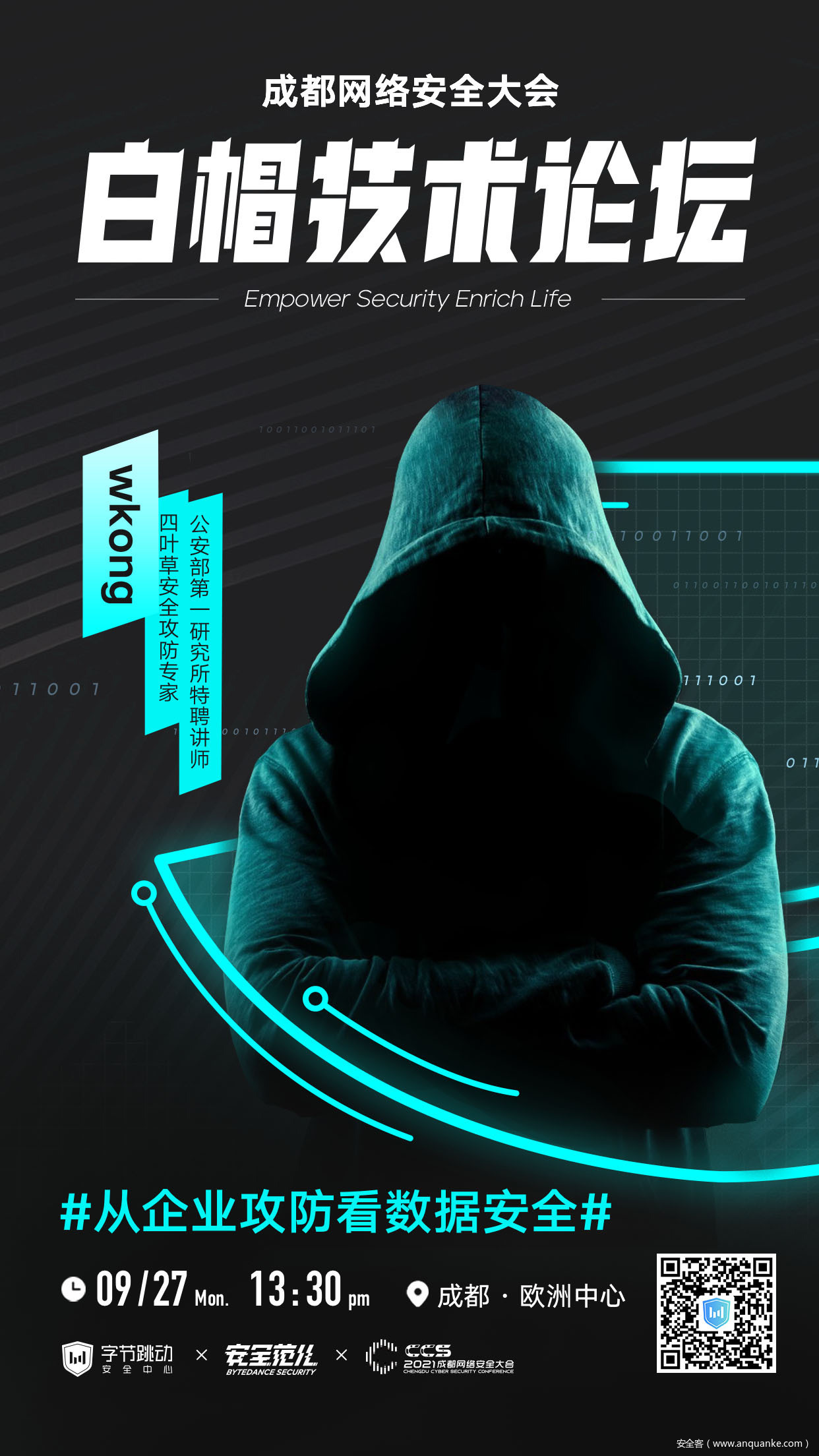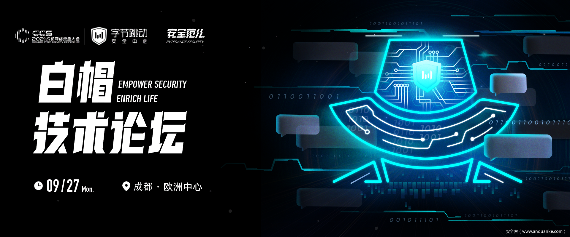 CCS 2021成都网络安全大会重新定档于2021年9月26-27日在成都市 “中国-欧洲中心”开幕,同时由字节跳动安全中心承办的安全范儿系列活动白帽技术论坛也将于9月27日下午举办。