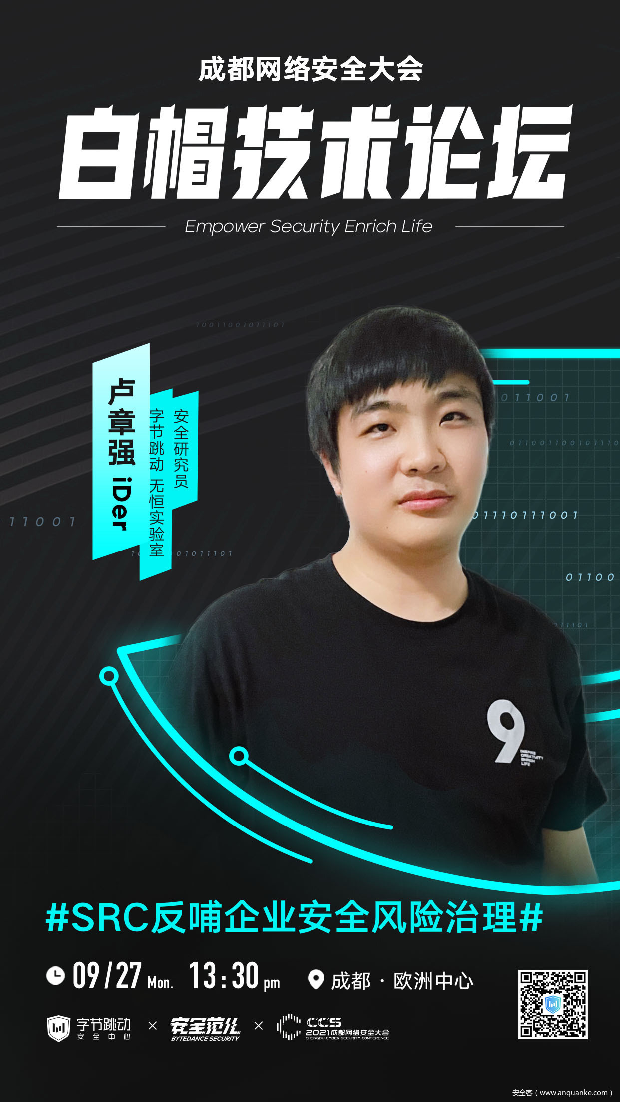 讲师介绍:卢章强(iDer),字节跳动无恒实验室蓝军。成长路线从白帽子到SRC审核和建设再到企业安全风险治理,曾参与多家SRC建设,专注于风险的发现与治理。