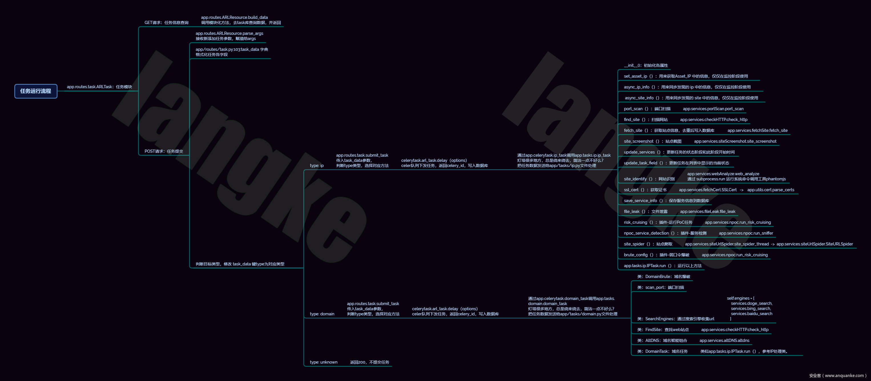 之前写过一个arl运行流程图,结果思维导图画出来了,可是还是有一些地方搞不懂怎么运行的,这就很纳闷了!今天看了一下Celery的文档,稍微对这个应用有了一些概念。然后趁热又去看了一下arl的源码,尝试再次梳理运行流程,上次的疑惑终于解开了。