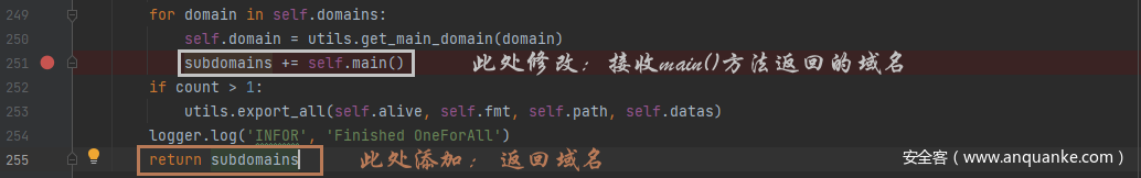 OneForAll当作一个类,输入一个域名作为参数,返回收集的域名列表。