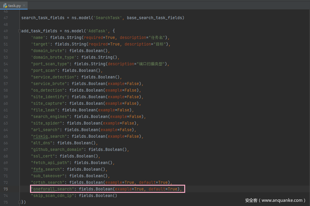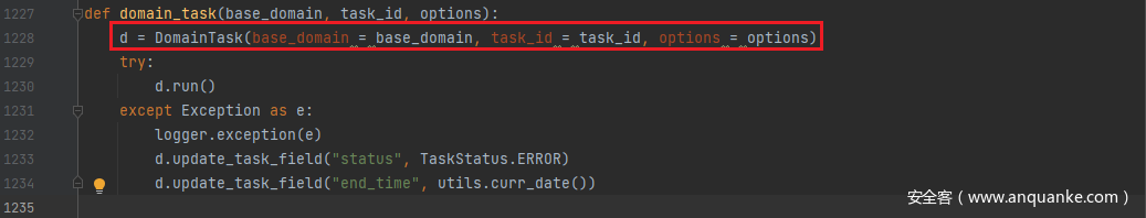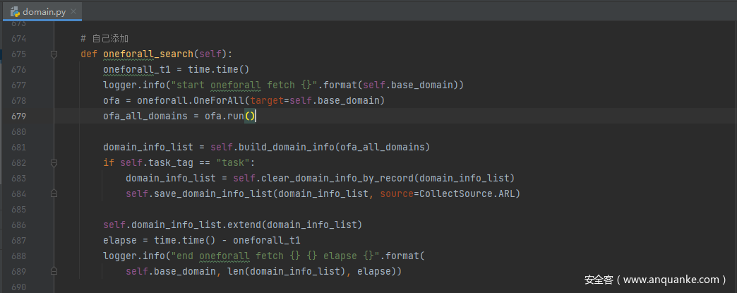 根据第二篇,现在已经知道了ARL域名收集的大致过程。改动就直接添加到domain.py中了。也看过其他类似的资产管理工具,直接把oneforall当作一个类,去实例化调用,从而集成到应用中。总感觉这样不优雅,又说不出来哪里别扭。