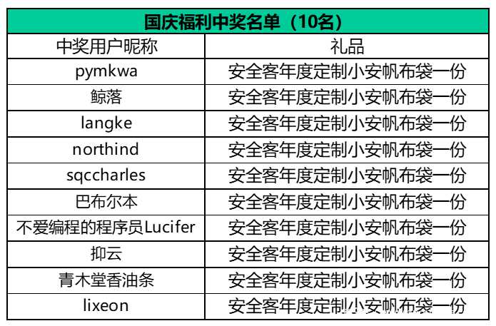 共迎国庆,“十一”来临之际,福利小安携手万千用户,一起给祖国母亲过生日!在本文评论区留言分享你在国庆假期与网络安全不得不说的趣事(不得少于15个字),我们将从中抽取10名用户,每人送上安全客年度定制小安帆布袋一份!