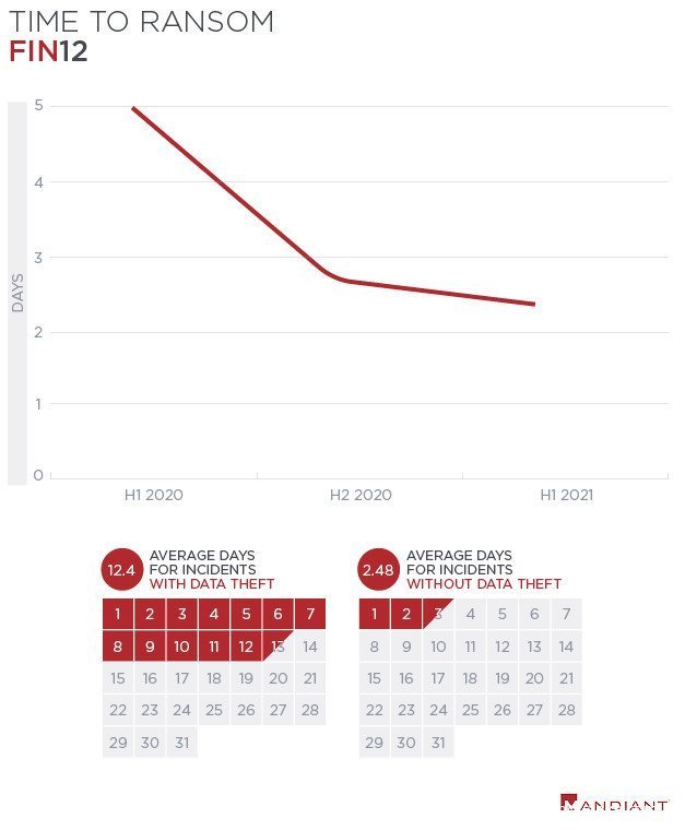 根据研究人员收集到的调查数据,大多数盗取数据的勒索团伙在攻击活动中的驻留时间(在目标系统中)为五天左右,而勒索软件攻击的平均驻留时间为12.4天。但自从FIN12出现之后,这个平均驻留时间每年都在下降,直到2021年上半年,勒索软件攻击的平均驻留时间甚至已经下降到了三天左右。