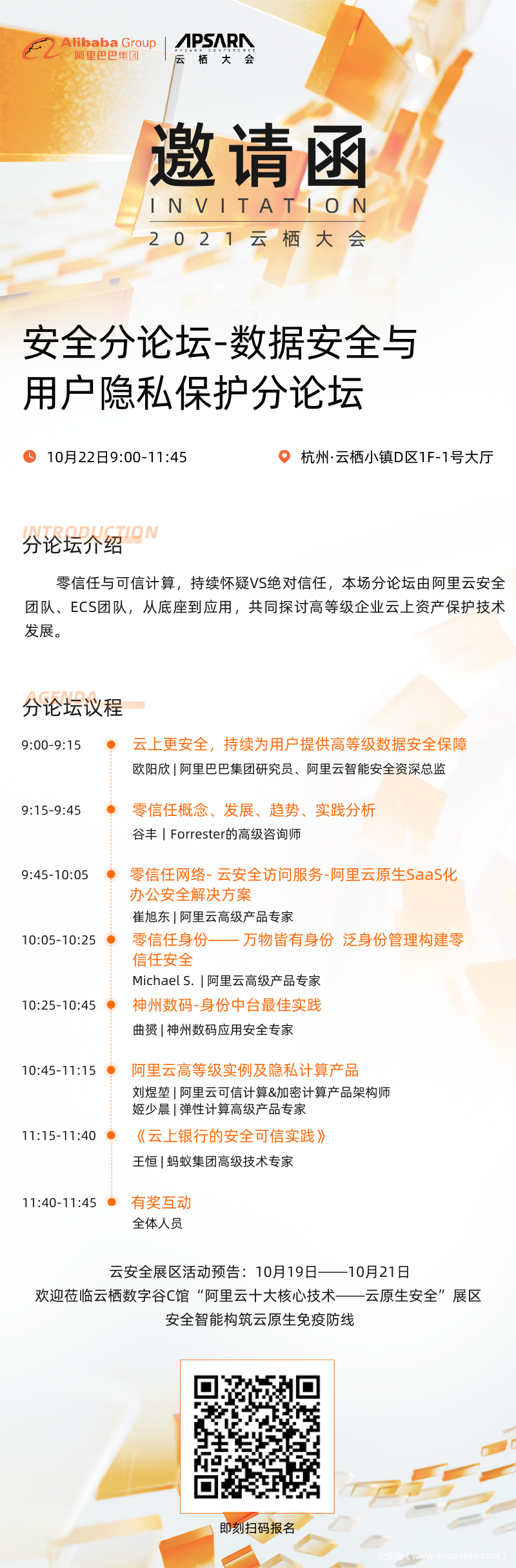 本场云上安全技术趋势论坛将首次正式对外发布阿里云“芯”科技,阿里云高等级可信实例与隐私计算产品与落地实践,严防云上数据安全信任防线,构建最高等级绝对信任;