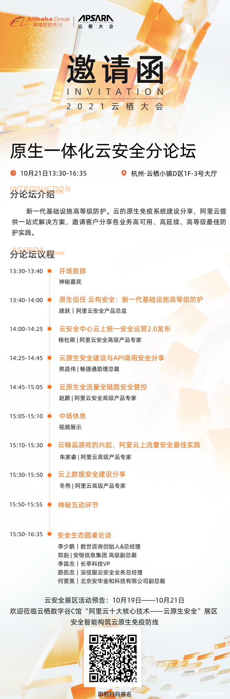 本场分论坛将由阿里云资深安全专家与企业安全建设者,多重运维角度分享关于“网络、流量、应用、数据”等热点话题原生云安全实践经验