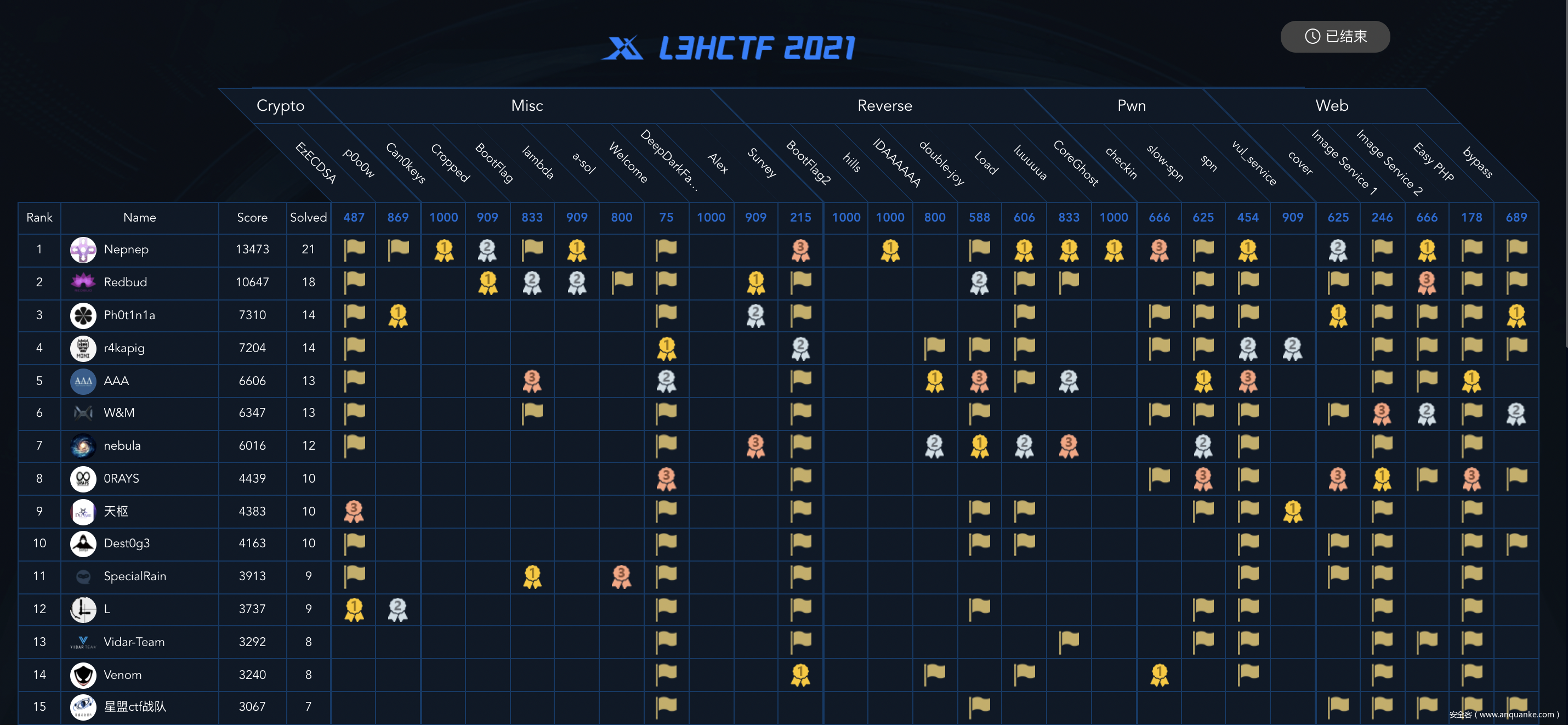 赛程行进至1/2,星星之火渐成燎原之势,大多数赛题已被先遣战队攻陷。Nepnep战队优势凸显,稳坐榜一之位;Redbud战队和AAA战队难解难分;W&M战队、nebula战队和r4kapig战队得分接近,分列4、5、6位。
