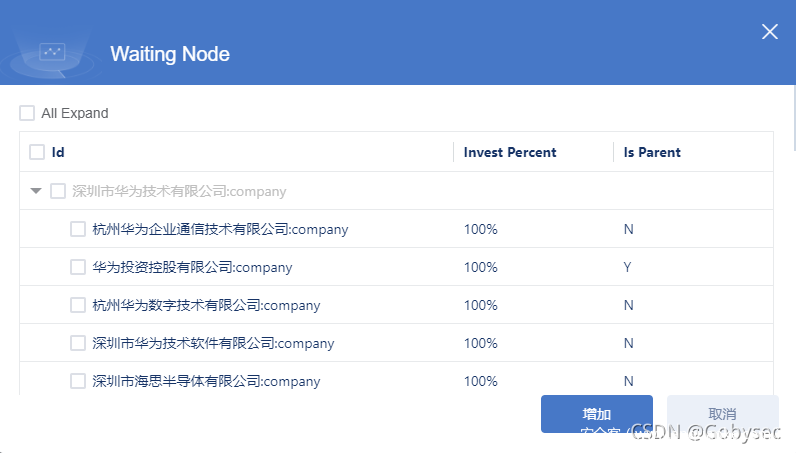 在弹出的框中,看到“华为投资控股有限公司”是“深圳市华为技术有限公司”的母公司(Is Parent 列为 Y),它的投资比例是 90%。很明显这家公司跟华为相关,把它勾选上,还有其他子公司(Is Parent 列为 N),粗略判断下,都勾上,再点击“增加”按钮添加。