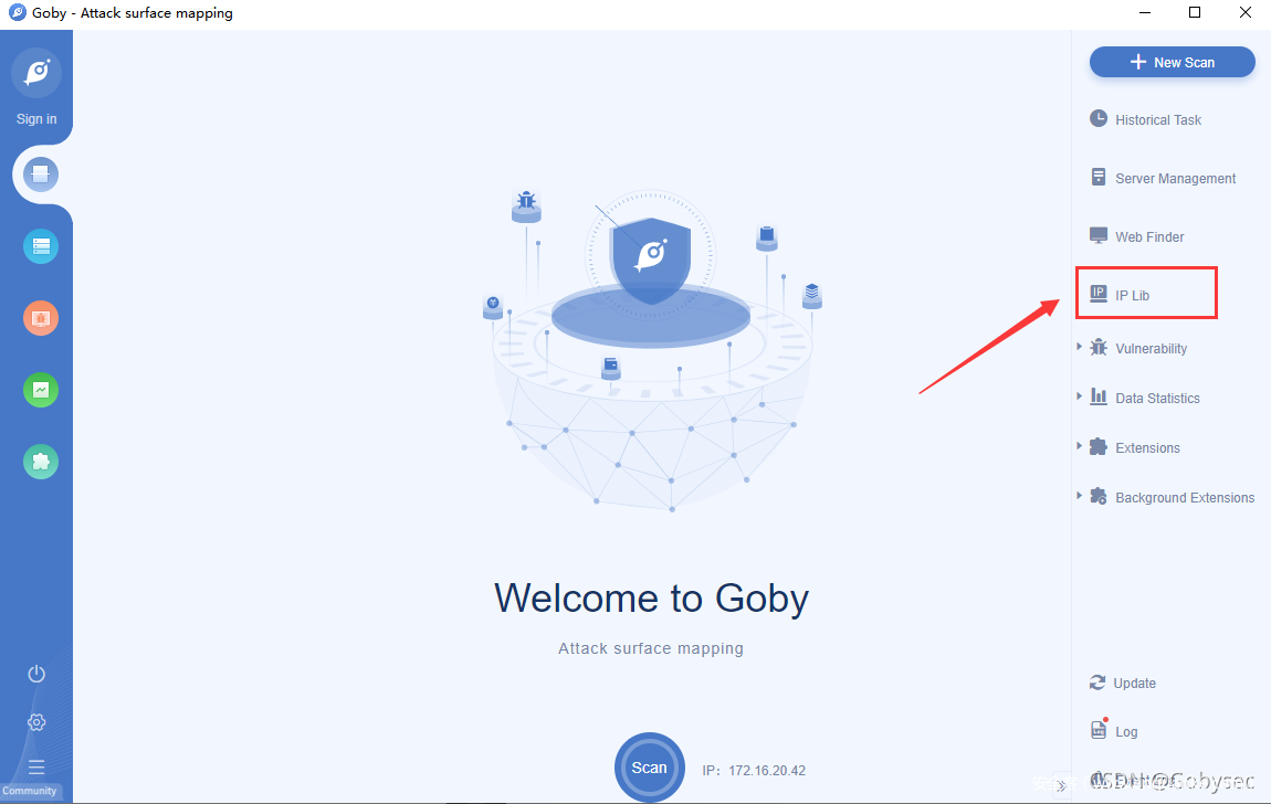 打开 Goby 最新版,点击右侧那个写着 “IP Lib” 的按钮,进入 IP 库。