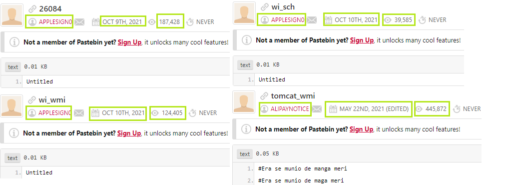 然而这些pastebin粘贴板文本大多为无实质操作的语句,粘贴板名通常与相关脚本url名和攻击手段、目标有关,其中对粘贴板的访问可直观地观察到入侵机器是否活跃和增长。并且创建者ID重复情况较多,可一定程度上作为该家族木马的关联。目前时间较早的粘贴板大部分已被删除,较近时间段(比如10月份)的URL则大多正常。