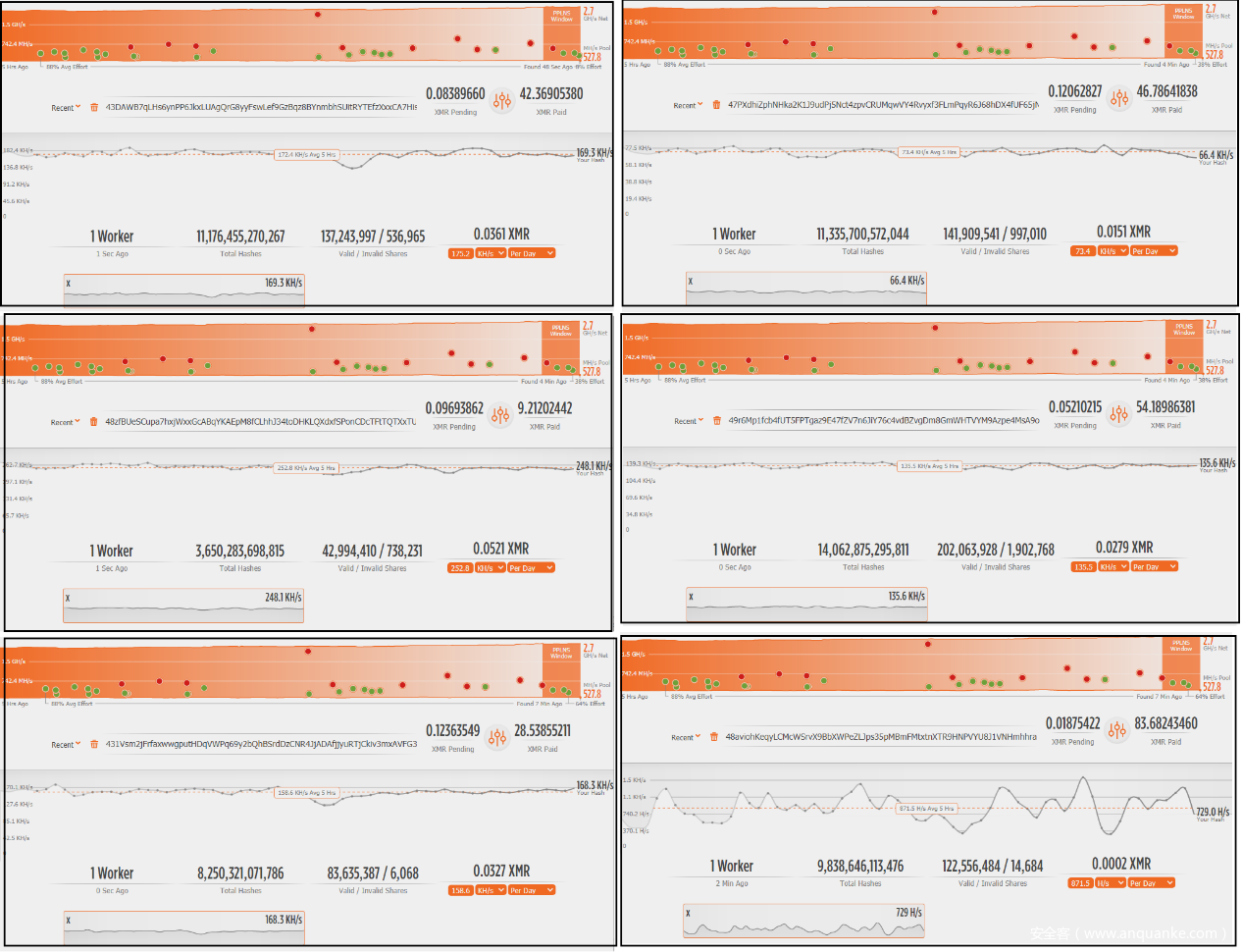 Config.json配置中的钱包地址并不只有一个,通过从钱包地址中取出几个还在活跃的钱包地址,在supportxmr中可以查看其算力和挖取的门罗币数据,以此判断JavaXminer的挖矿能力。