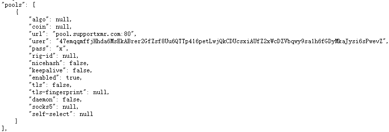 Config.json配置文件中,指定矿池为pool.supportxmr.com:80,而pass统一为“x”。