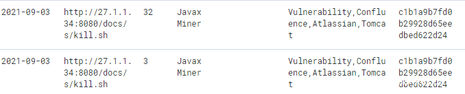 JavaXminer的入侵往往会利用新近曝出的Web服务端1Day或是nDay漏洞,成本降低的同时,又可以较为轻易的获取未及时修补漏洞的服务器访问权限。比如Atlassian Confluence在今年8月底发布的CVE-2021-26084 RCE漏洞,GitHub上9月1日便出现了相应利用POC,紧接着在9月3日就出现了利用该漏洞对Confluence发起的攻击。