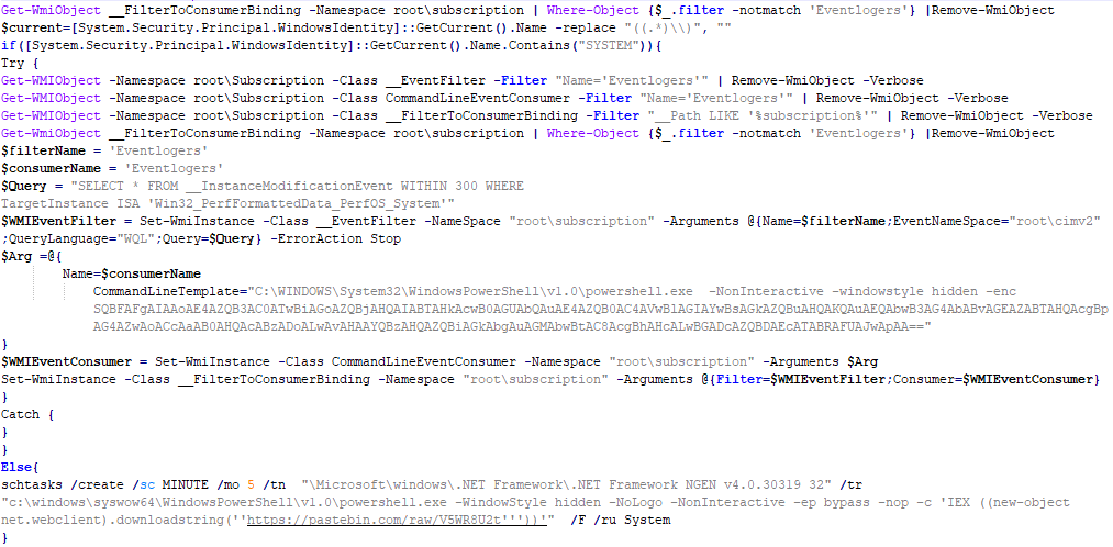 在Windows系统的机器上,JavaXminer同样会进行持久化,访问相应pastebin数据执行——即使大部分均为无效指令。创建持久化任务的方式则是采用WMI Subscription事件或是schtasks命令。