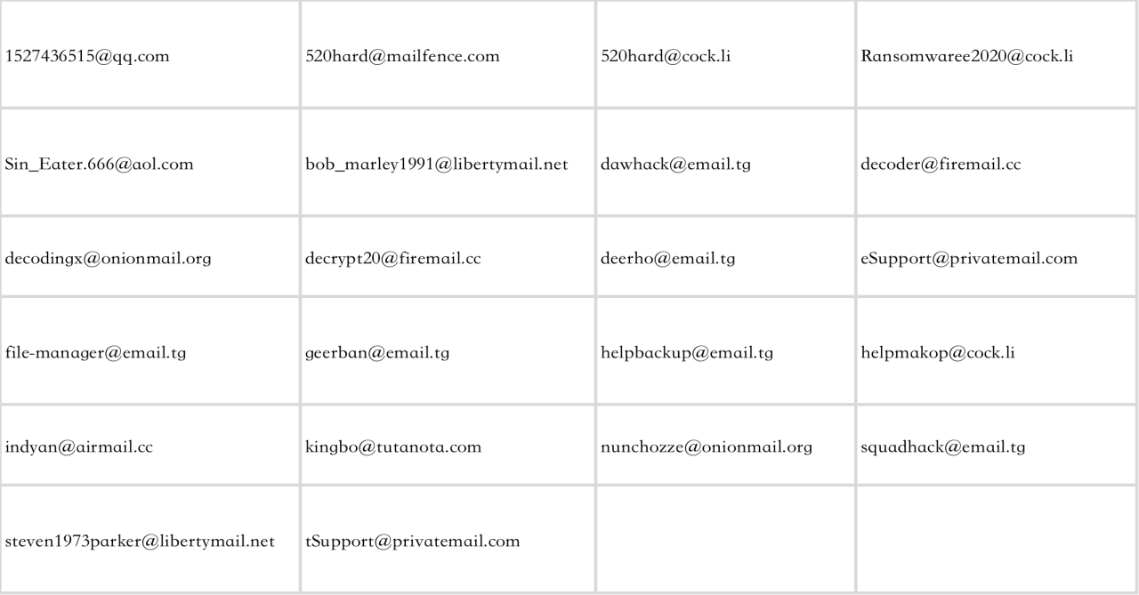 使用沙箱对这些样本进行进行了深度分析和行为抓取,2021年11月份出现的黑客勒索邮箱列表如下所示,photos勒索家族的邮箱域名主要以email.tg、cock.li为主,这是一个今年4月份就非常活跃的勒索团伙,样本目前还在活跃中。