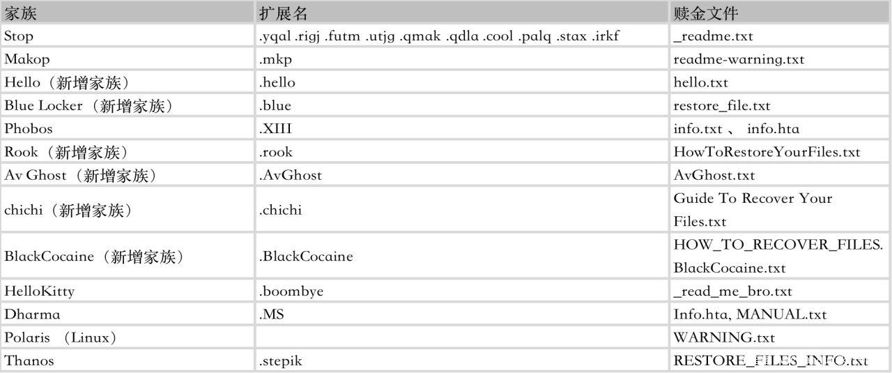 不同的勒索家族在勒索后缀上总会存在一些较大的差异性,同一家族内的后缀会存在较大的相似性,可以利用这个信息快速的区分勒索的家族信息,11月份统计的影响量top的勒索家族的后缀信息统计入下表,近期被受到勒索攻击的用户可以表中提供的后缀查询所属的所属的家族: