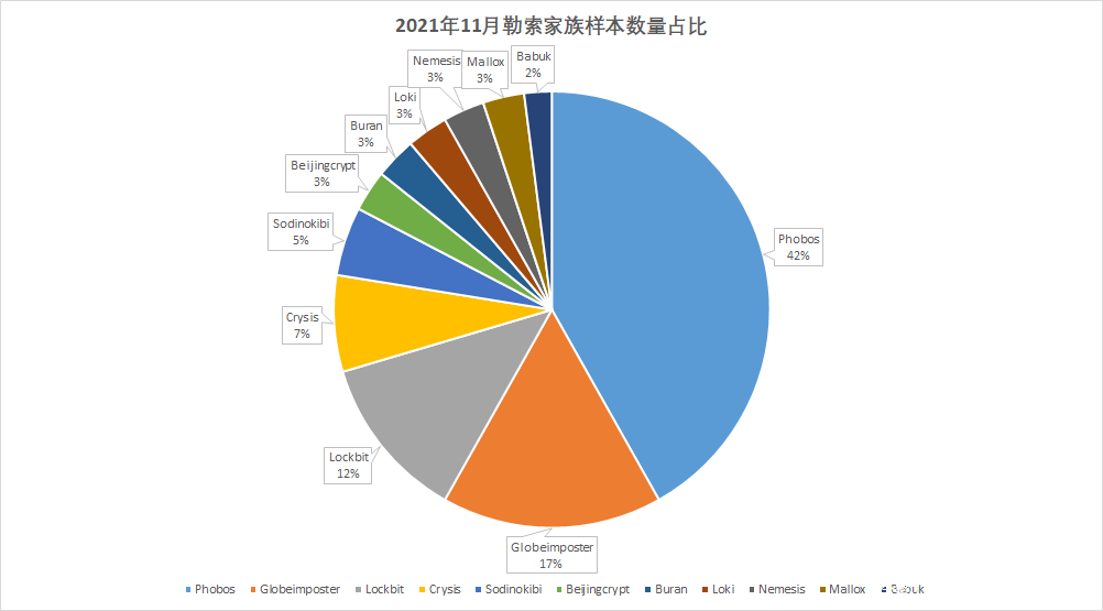 其中Phobos家族的样本量占比较上月有进一步增长,Globeimposter、Babuk、Mallox家族则有所下降。而BeijingCrypt、Loki、Nemesis则是较上月的新增家族,样本数量占比较小。