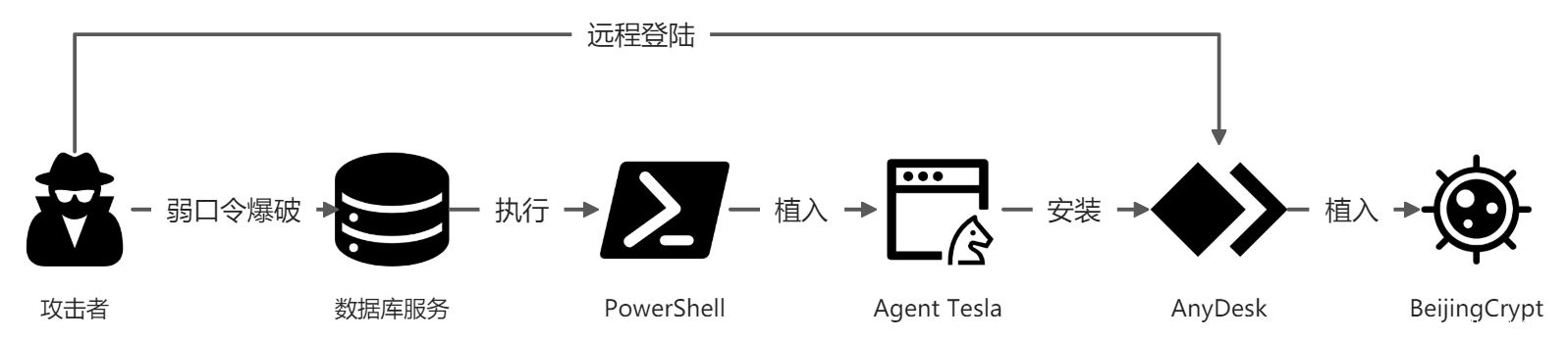 另外值得注意的是,阿里云安全中心在本月捕获了BeijingCrypt家族的最新变种,此变种最早出现于2021年10月。不同以往,黑客在此次的攻击链路中以数据库服务为入侵点,并结合RAT远控木马作为Dropper来实施后续的攻击行为。由此可见,RDP和数据库的弱口令、空口令的问题需要引起重视。