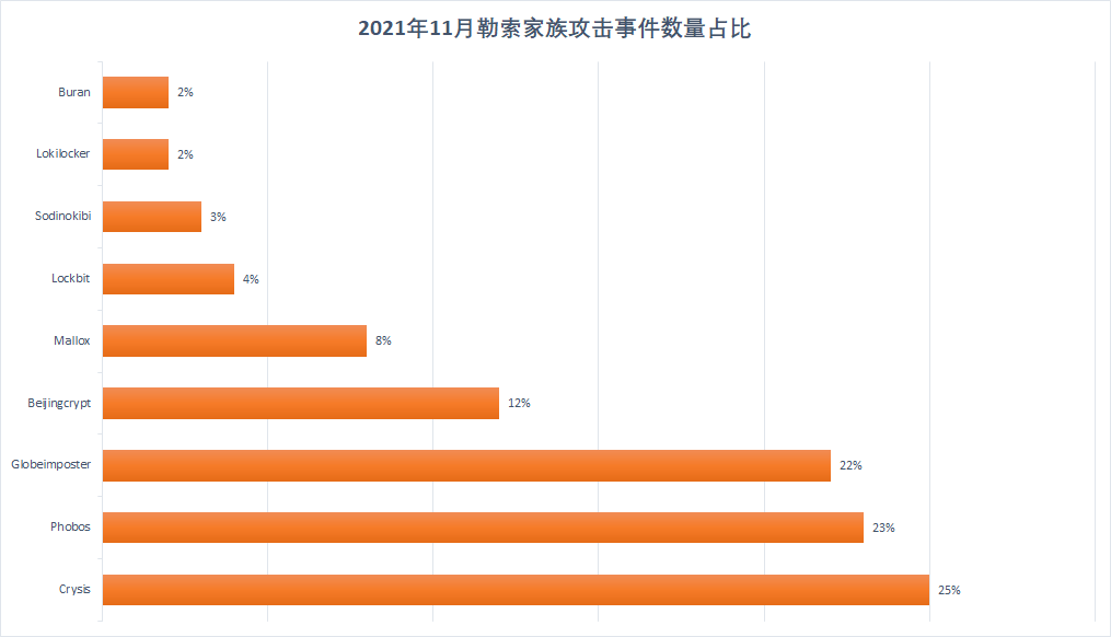 老牌勒索家族Crysis在本月的攻击事件数量跃居第一,Globeimposter和Phobos家族的占比则有所下降。而在本月最新捕获的BeijingCrypt勒索家族也有着不小的占比,值得警惕。