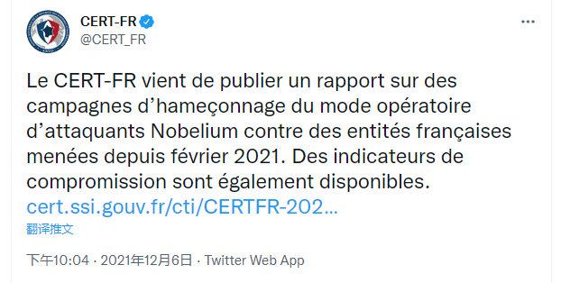 1、Nobelium黑客组织盯上法国实体