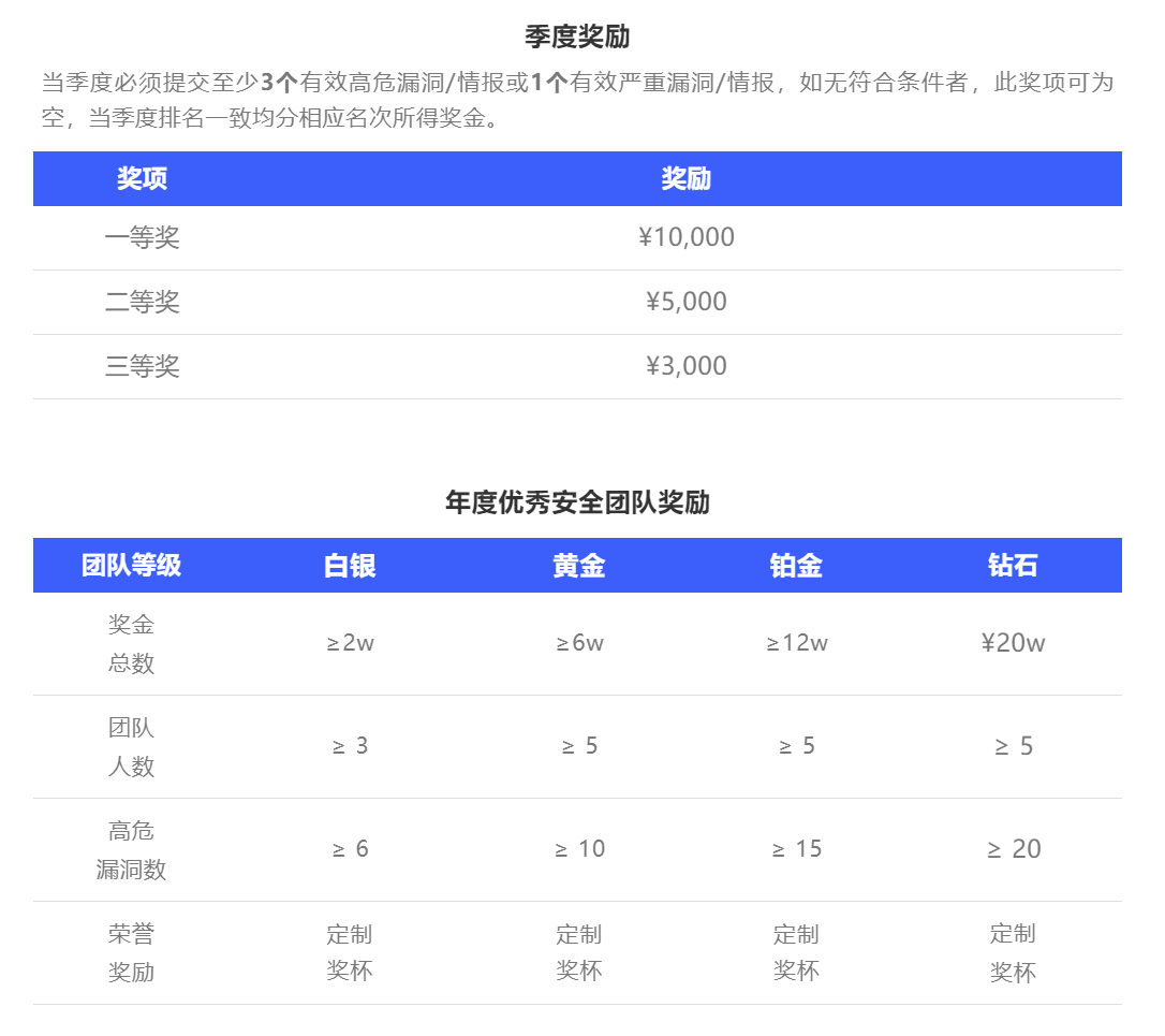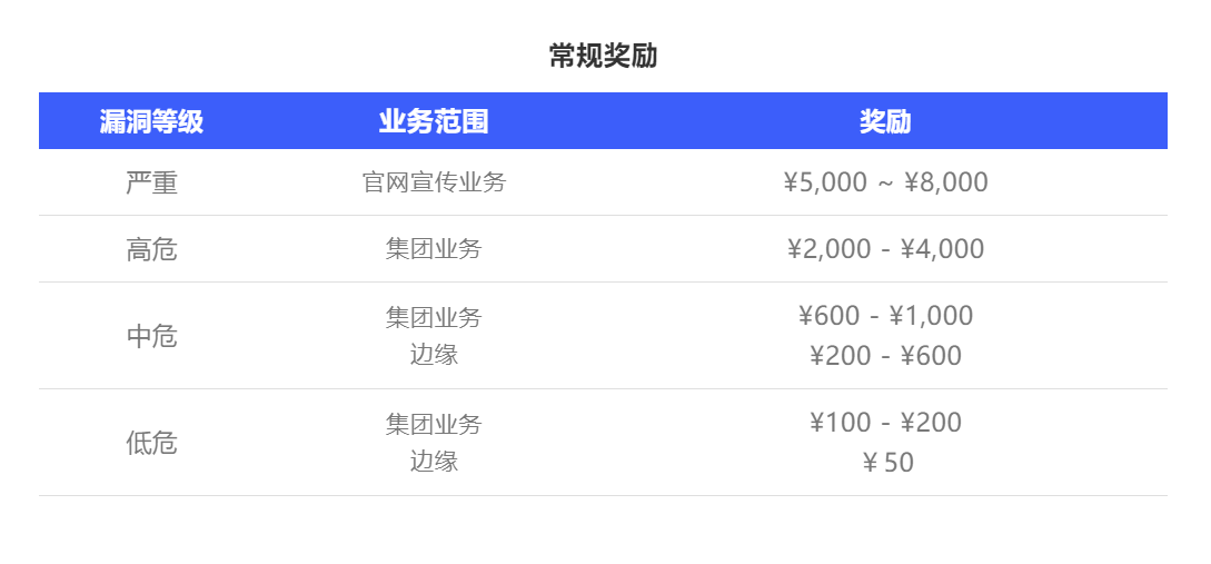 凡是已经确认的有效漏洞所影响的系统为官宣业务且漏洞等级为严重,根据漏洞对业务产生的实际危害,对漏洞进行二次综合评定,选出对平安安全提升最大的最具价值漏洞,除常规漏洞奖励之外,视情况额外奖励5~8万元人民币。