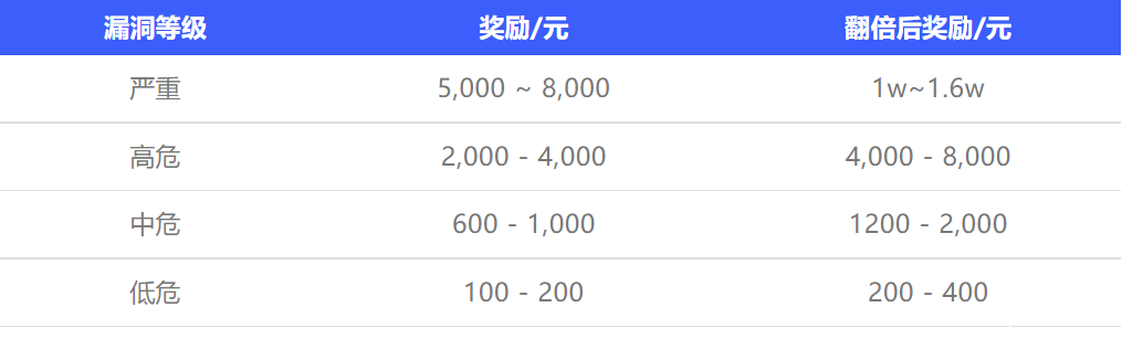 漏洞等级:活动时间段内的有效漏洞(低危及以上)进行翻倍奖励。