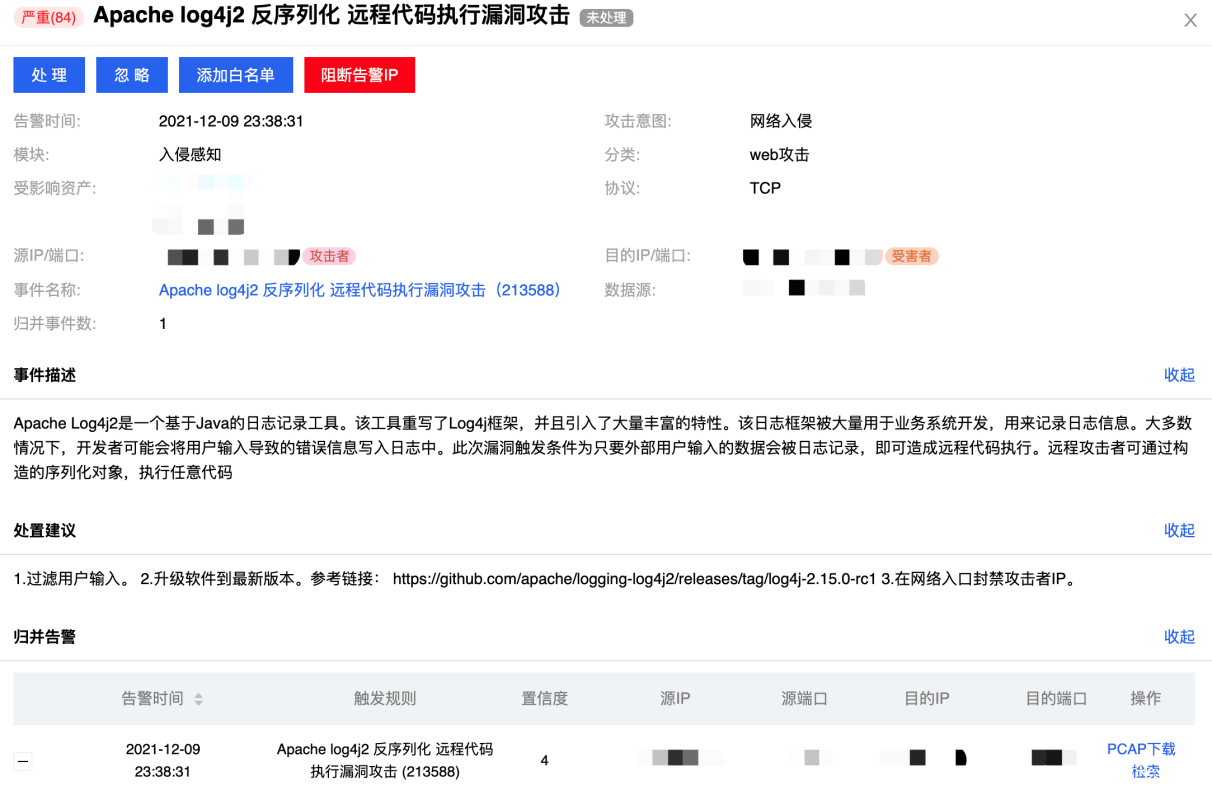 1、腾讯T-Sec Web应用防火墙(WAF)、腾讯T-Sec高级威胁检测系统(NDR、御界)、腾讯T-Sec云防火墙已支持检测拦截利用Apache Log4j2远程代码执行漏洞的攻击活动。