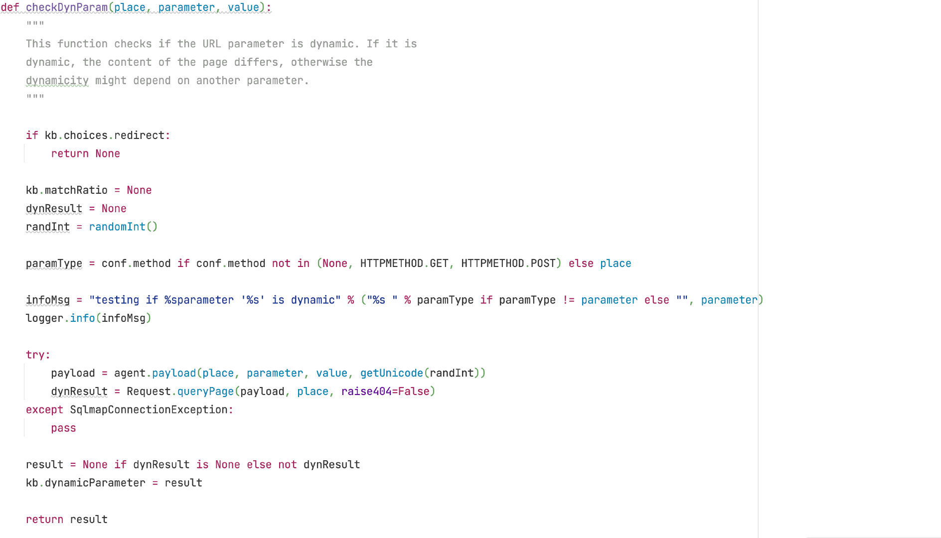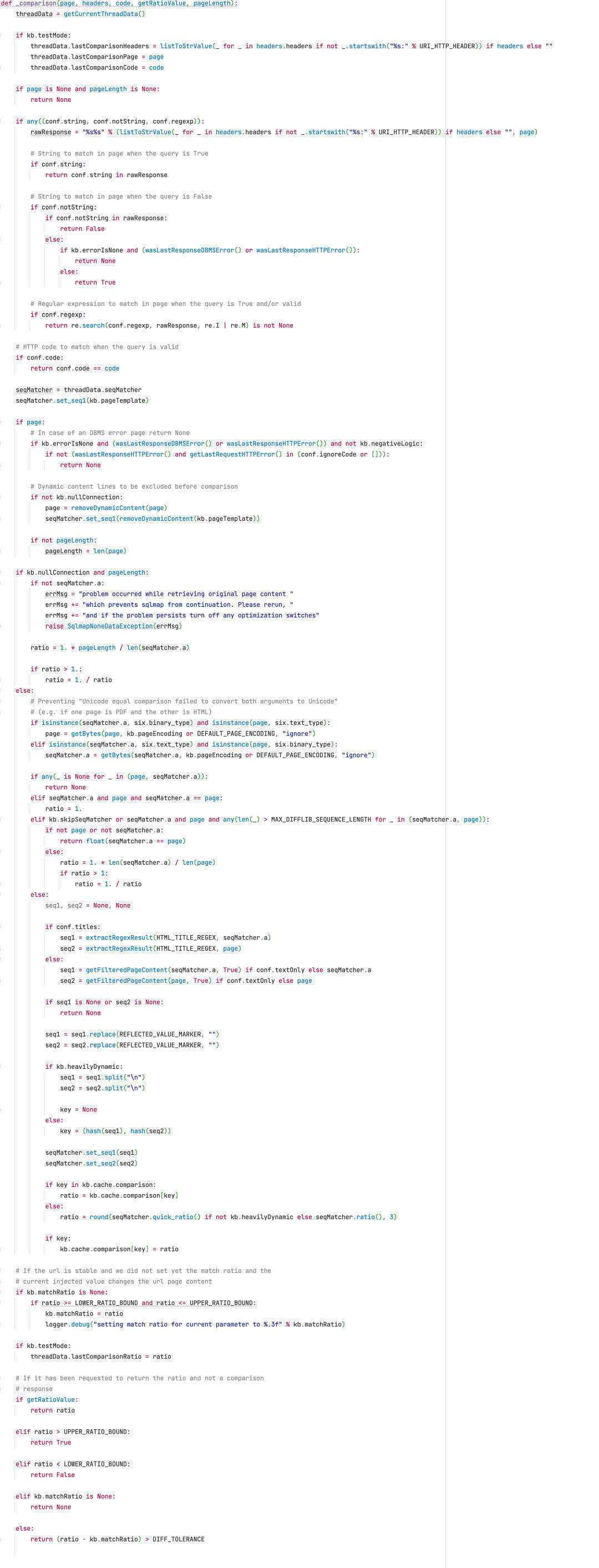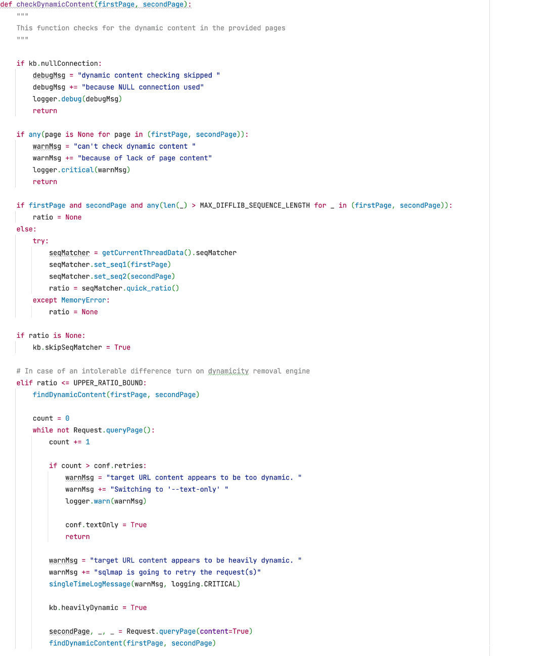 上面就是 checkDynParam 函数的整体逻辑,从代码上可以看出其实核心逻辑都在 queryPage 函数中,这个函数在 sqlmap 中具有相当重要的地位,它会根据请求参数的不同来返回不同的返回值,这也是 sqlmap 耦合度太高的具体体现,下面笔者将重点分析 queryPage 函数的实现。