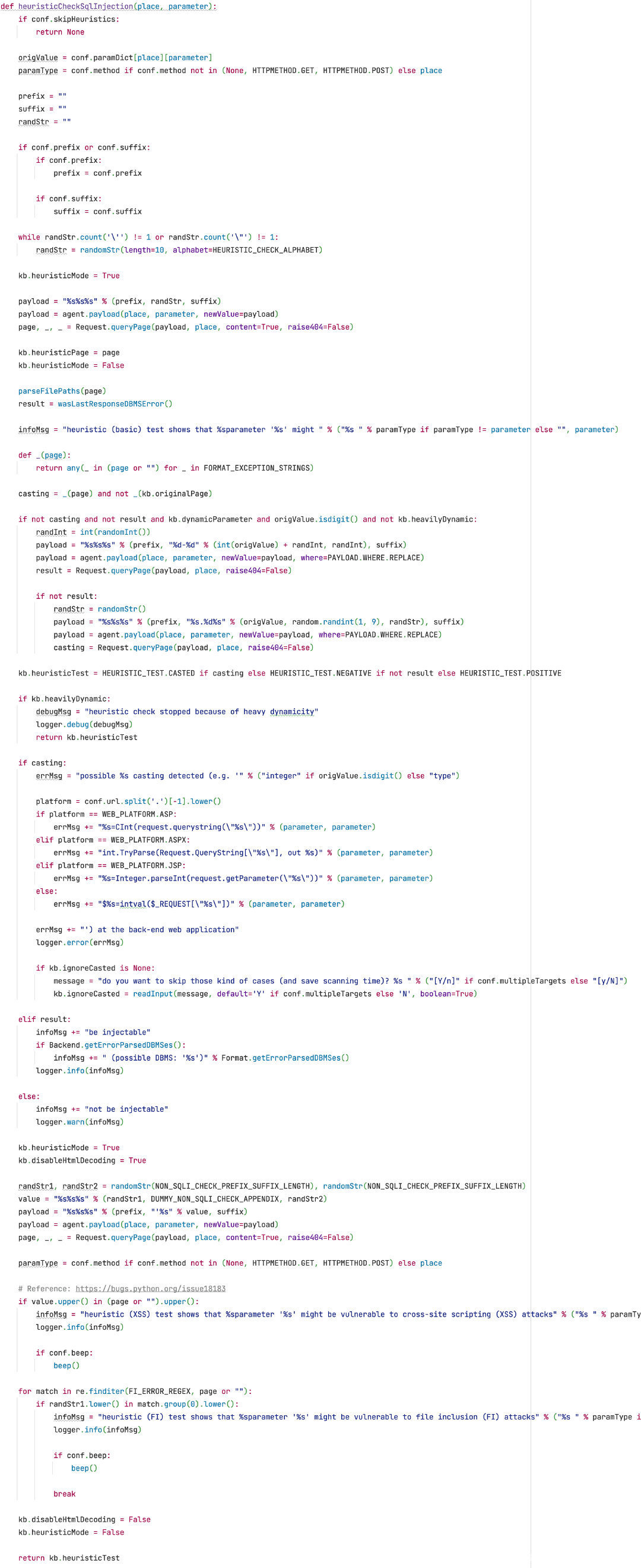 sqlmap 调用 heuristicCheckSqlInjection 函数实现启发性测试: