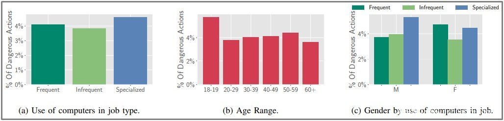 也就是说,仅从性别上来看,并不能判别出谁在网络钓鱼攻击面前更容易中招。反倒是在年龄上有一定的差异。研究结果显示,年轻人和老年人更容易点击网络钓鱼链接,以及与那些不需要计算机来完成日常工作的人相比,使用专门软件执行重复性任务的人更容易陷入网络钓鱼陷阱。