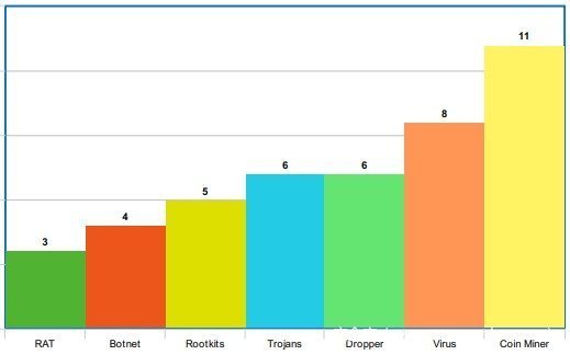 据统计,挖矿软件是Windows蜜罐监测到最多的恶意软件,其次是病毒,dropper和特洛伊木马。