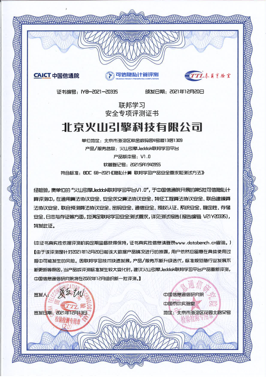2021年12月21日,由中国信息通信研究院(简称“中国信通院”)等单位主办的数据安全产业峰会成功召开。在会议现场,信通院公布了第十三批大数据产品能力测评结果,字节跳动安全研究团队推出的”火山引擎Jeddak联邦学习平台”,作为参加评测的六个联邦学习产品之一,通过了信通院的“联邦学习安全专项评测”。