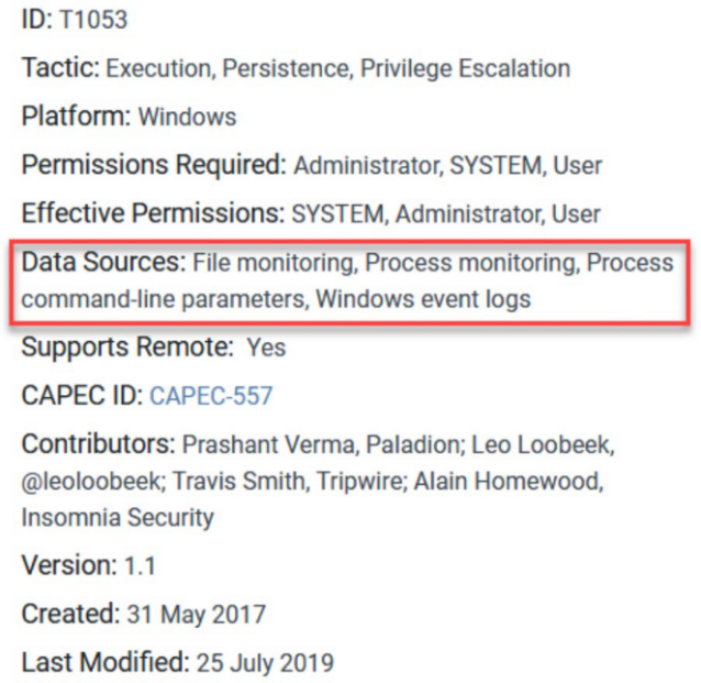要确定安全团队缺失哪些重要数据源,首先需要使用 MITRE 提供的 API 或 GitHub 上的其他开源工具,提取有用的技术或整个框架的数据源信息。在此基础上,再去了解安全团队有权访问的数据源,以及有权访问这些数据源的用户组和系统,这样可以发现对于关键攻击技术在数据收集和数据可见性方面存在的差距。例如,收集的威胁情报表明,计划任务技术是攻击组织使用的主要技术,想要知道安全团队是否可以检测到它,在ATT&CK框架中列出的该技术的数据源——文件监控、进程监控、进程命令行参数和 Windows 事件日志可以提供答案,如下图展示了计划任务技术的数据源。如果安全团队没有这些数据源,或者只有环境中的部分系统有这些数据源,那么安全团队需要优先考虑改善这个重要数据源缺失的问题。