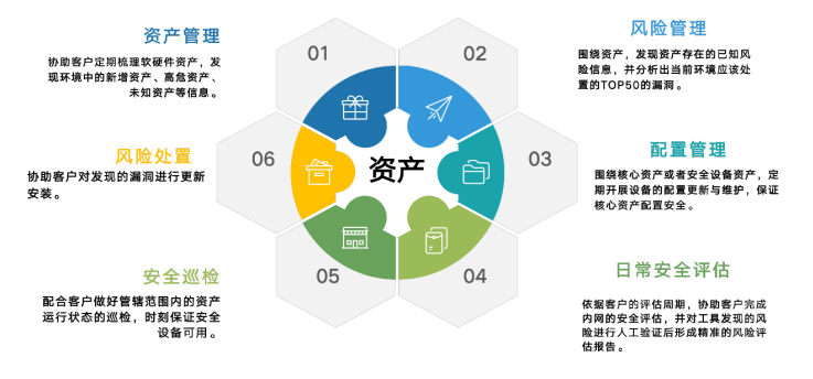 1.资产管理运营服务:协助客户厘清资产,做到知彼先知己,并通过资产分类和量化管理,逐步实现客户内网资产的精细化管理。