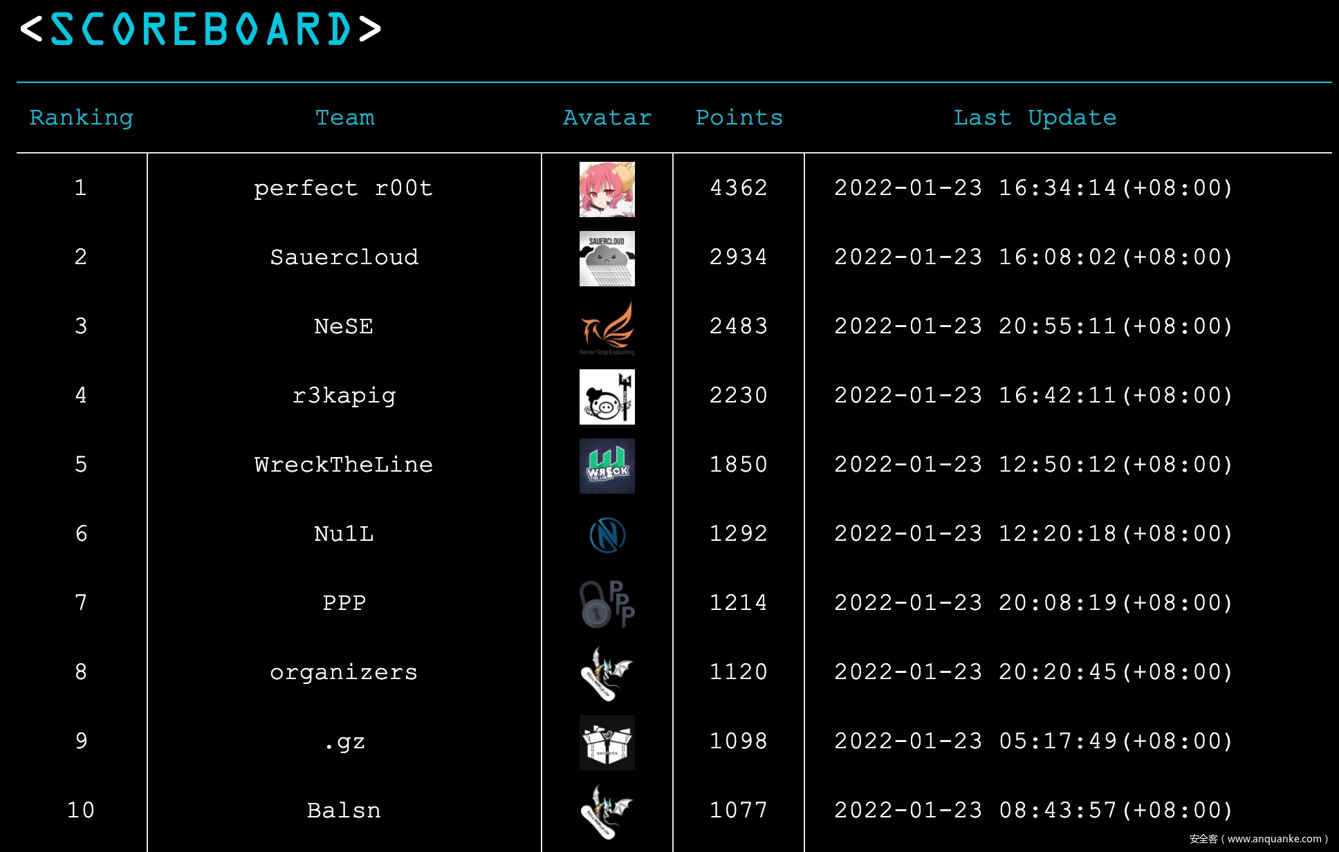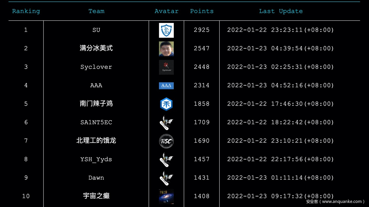 最终,由来自众多高校联合(江西软件职业技术大学、南京航空航天大学、广州航海学院和某些不愿透露姓名的高校)的SU战队以2925的总分获得第一名,由来自北京邮电大学的满分冰美式战队和来自成都信息工程大学的Syclover战队分别以总分2547和2448名列第二名和第三名。
