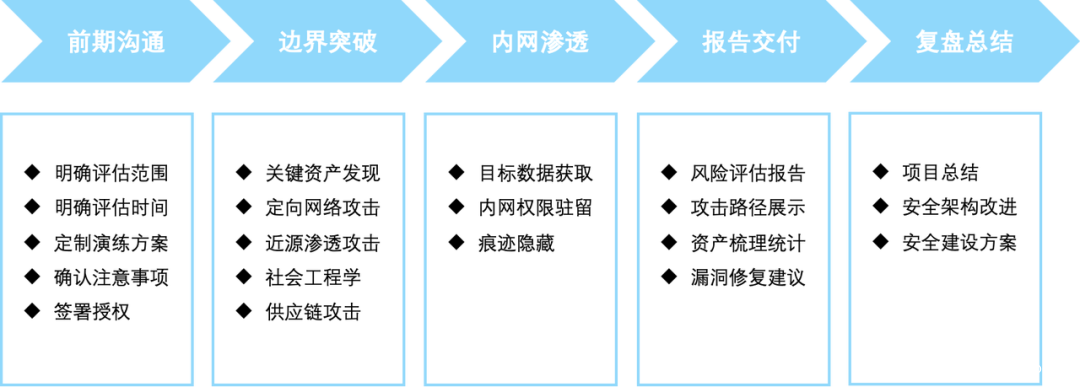 在字节跳动内部的不断打磨下,无恒实验室积累了丰富的红蓝对抗经验,并以火山引擎平台为载体对外提供服务。火山引擎云安全红蓝对抗服务会根据企业的需求来定制演练方案,主要分为前期沟通、边界突破、内网渗透、报告交付、复盘总结五个阶段。