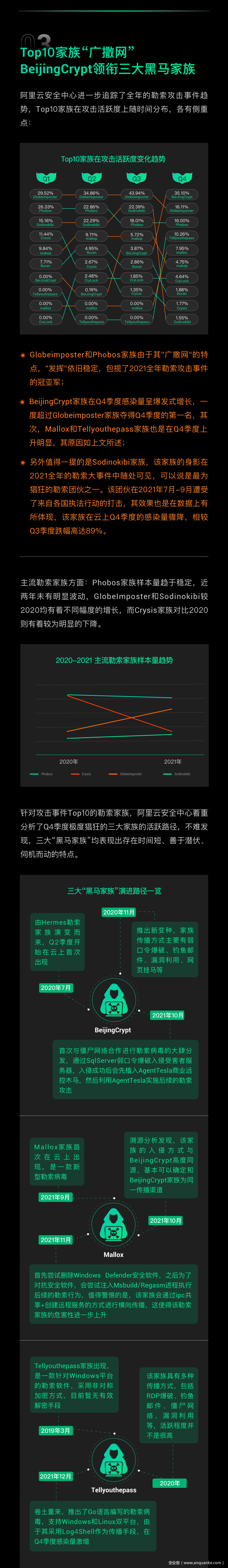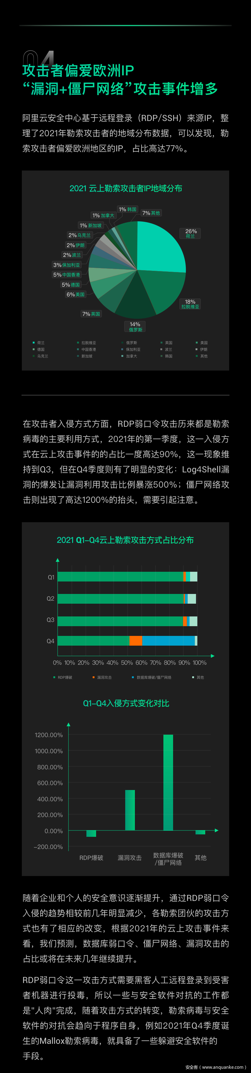 受漏洞和僵尸网络影响,云上勒索家族和变种数量在4季度显著上升,入侵方式的转变需引起注意;