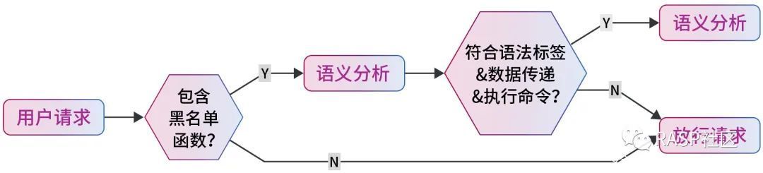 由于云鲨 RASP 工作在应用运行时环境,可以直接获取到解密后的流量,无需考虑加解密场景和伪装和变形的流量。只需要根据对应语言设计对应的识别参数,只要用户请求中包含此类逻辑,并且涉及到黑名单函数,即可进行精准拦截。检测逻辑如下图所示: