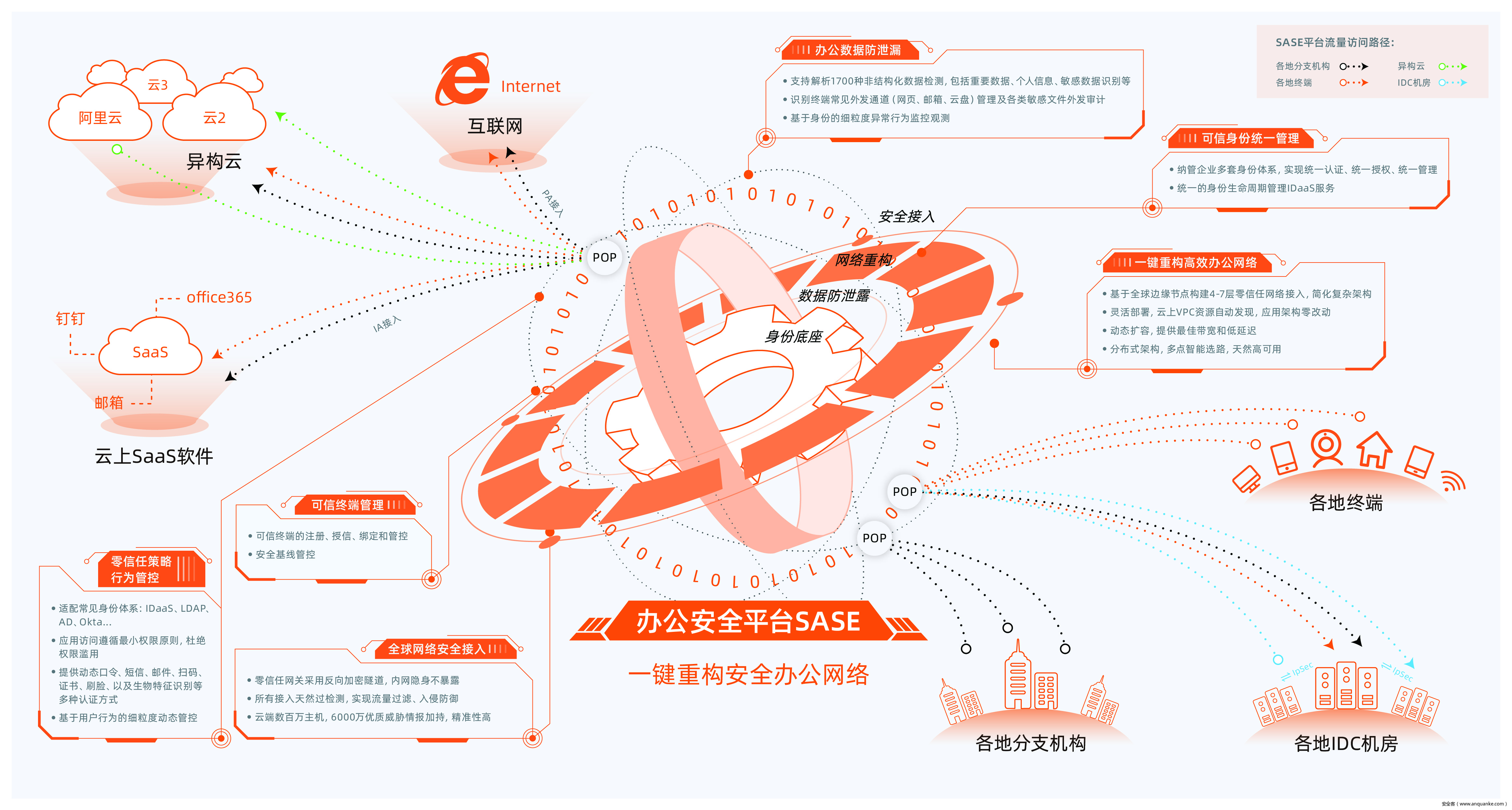 ●全球300个POP节点,重新定义网络接入:不再使用传统的IPSec VPN模式,而是通过POP点接入SASE办公平台,再由SD-WAN功能进行多点智能选路, 使用阿里云和各地运营商构建全域覆盖的边缘节点,保证了办公网低延时传输;