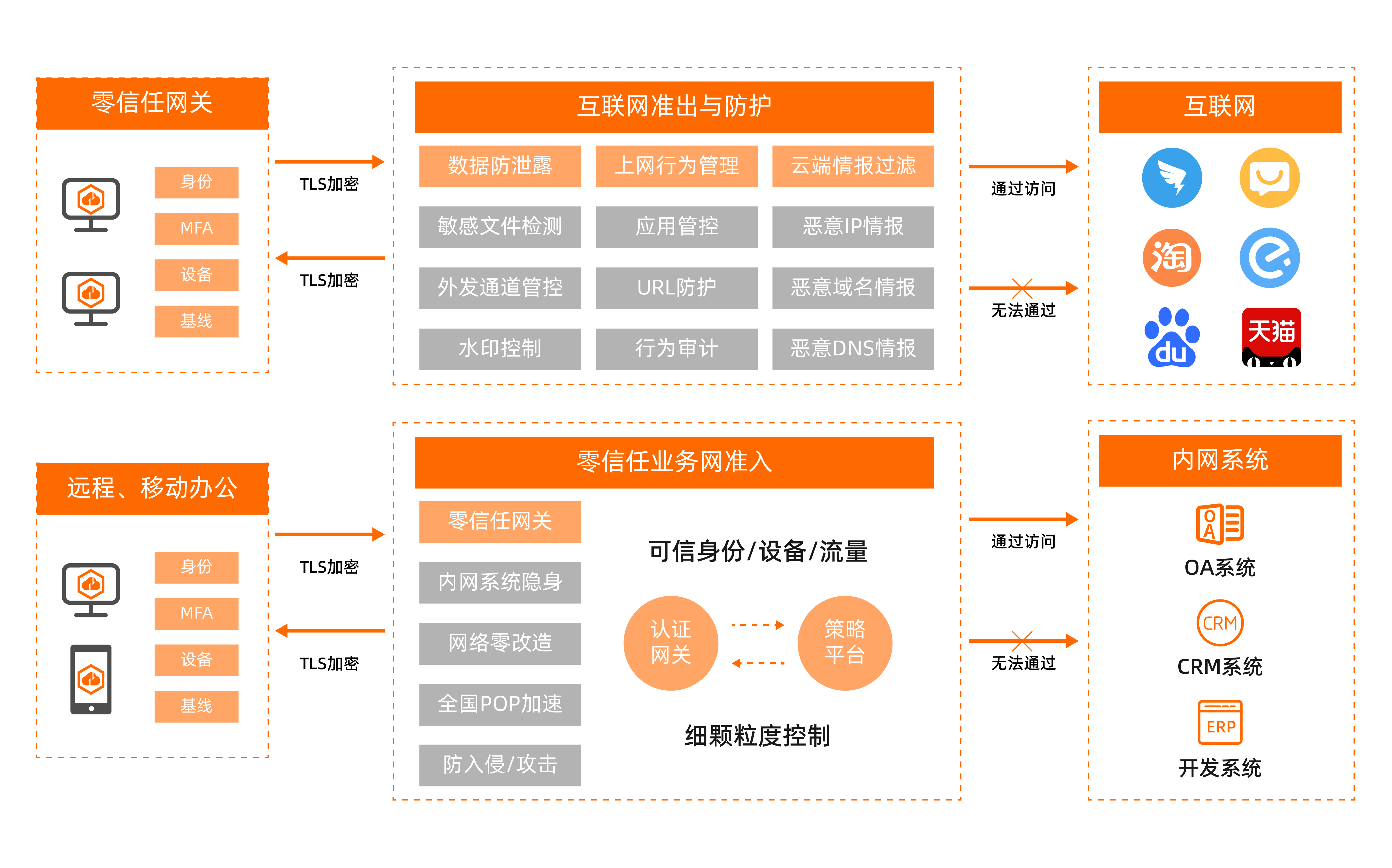 ●摒弃传统VPN,采用SDP零信任网关,以反向加密通道实现内网应用/资产隐身,并以阿里云官方域名进行兜底,杜绝外部恶意扫描;