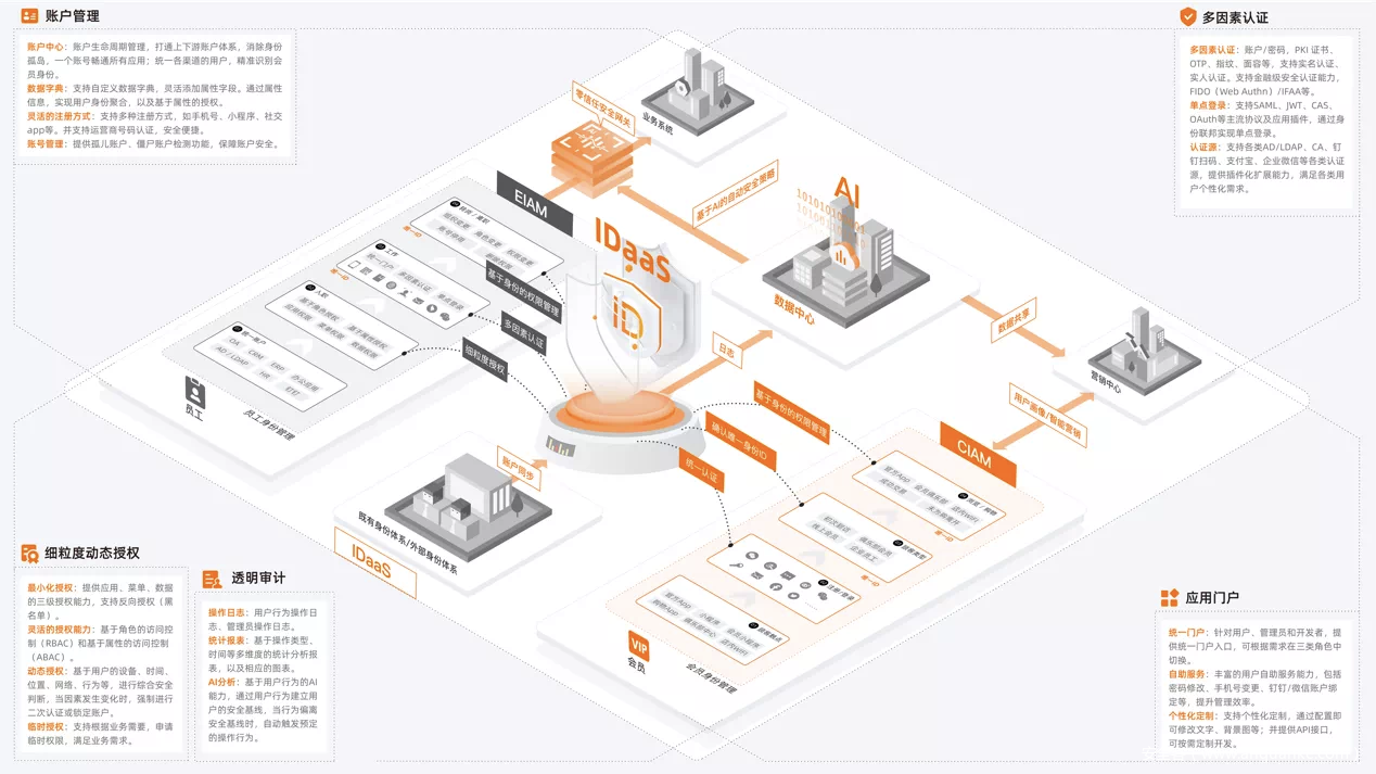 ●IDaaS统一身份服务,支持企业采用多因素认证、多维度动态授权以及基于应用的身份隔离,从底层将多套身份体系打通并实现统一可视化管理,支持上千种应用的轻松接入;