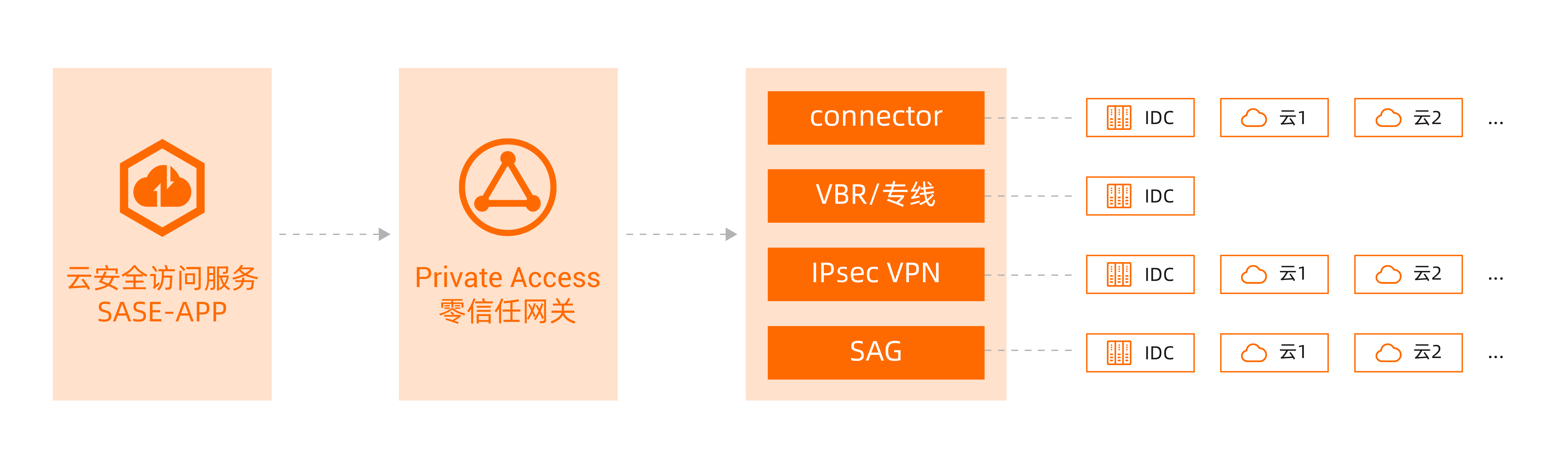 ●云上VPC资源自动发现,访问网络一键打通:对于部署在阿里云上的内网业务应用资源,只需要在配置中一键打通VPC网络即可;对于部署在其他云或本地IDC机房资源,既可使用阿里云提供的VBR、VPN或SAG来打通,也可以选择使用Connector组件进行流量牵引。阿里云的Connector自身具备负载,并且可以通过互联网反向代理TLS加密,稳定性更高。