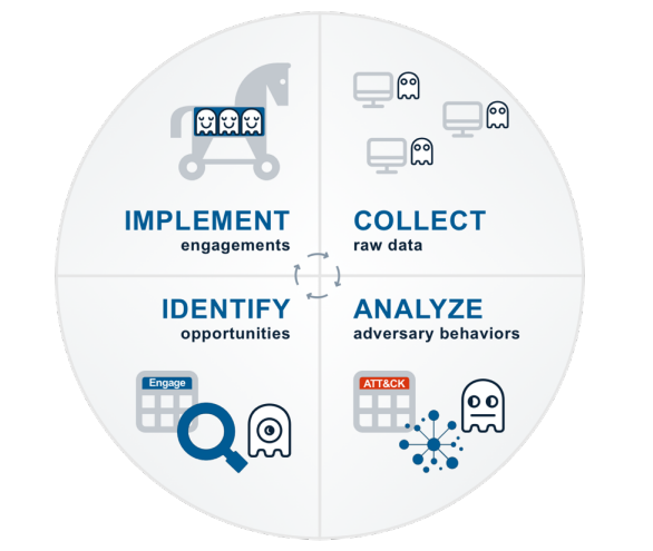 对手作战行动应该是一个持续迭代的过程,需要根据攻击者的行为和防御目标的变化不断地完善和调整作战活动。对手作战行动的周期(见下图)由四个循环的阶段组成。首先利用采集器从网络收集原始数据。然后利用 MITRE ATT&CK 等工具来分析这些数据并和以往的攻击者行为进行比较,以识别攻击者的行为模式,如攻击者的 TTPs。接下来利用 MITRE Engage 矩阵来识别为达成防御目标的作战机会。最后,根据确定的机会实施作战行动。