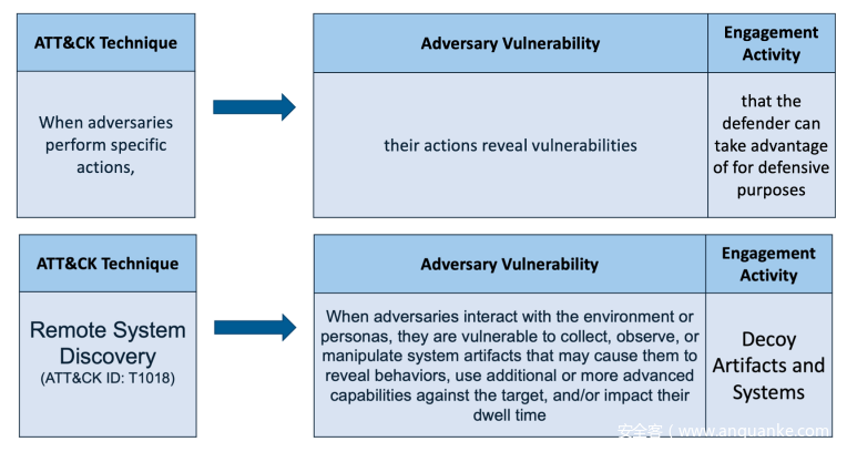 Engage 矩阵中的作战活动是和 MITRE ATT&CK 矩阵映射起来的。当攻击者进行某项特定行为(这对应于攻击者的某个TTP)时,他们很容易暴露出一些意想不到的弱点。ATT&CK 矩阵中的每个技术都映射到 Engage 矩阵中的一个或者多个作战活动,也就是针对攻击者采用的每个技战术,都可在 Engage 矩阵中找到相应的弱点和利用这些弱点的作战活动。例如下图,当攻击者尝试发现远端系统(采用 ATT&CK 技术 Remote System Discovery)时,需要与远端系统进行交互并对收集的远端系统信息进行处理,此时攻击者的交互行为会被远端系统感知到,攻击者也容易受到远端系统提供的信息的影响(战术弱点),那么防御就可以采取相应的作战活动(诱饵系统)来使攻击者暴露或使攻击者花费精力来鉴别收集到的信息。通过将作战活动和 ATT&CK 矩阵映射起来,可以保证我们的作战活动是攻击行为驱动的,并且能够更好地规划应当采取哪些作战活动。