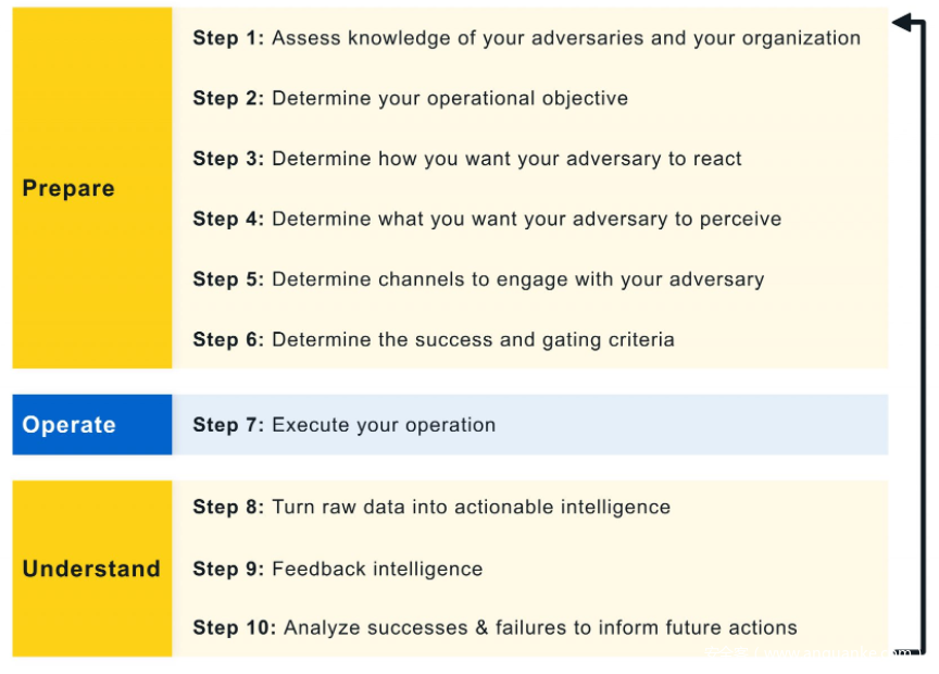 虽然作战性活动经常受到关注,但是在作战行动中最重要的部分是战略性活动,即作战的准备和对作战结果的理解。对手作战 10 步流程(见下图)分为准备(Prepare)、作战(Operate)和理解(Understand)三个阶段,和 Engage 矩阵的作战目标相对应。其中步骤 1 至步骤 6 对应 Engage 矩阵作战目标准备下的作战活动,步骤 7 对应 Engage 矩阵作战目标暴露,影响,引出下的作战活动,步骤 8 至步骤 10 对应 Engage 矩阵作战目标理解下的作战活动。在准备阶段,防御者需要了解攻击者和自身的优劣势,即知己知彼;明确作战行动的目标;确定为了推进作战目标实现,希望攻击者在作战行动中的反应;确定为了使攻击者作出这些反应而需要使攻击者感知到什么;确定作战渠道,即在欺骗故事和作战环境中寻找将需要被攻击者感知到的东西展现给攻击者的方法;明确作战行动的成功标准和把控标准,把控标准即在哪些情况下需要无条件暂停或终止作战行动。作战阶段即将作战计划付诸实践并和攻击者进行作战。在理解阶段,防御者需要将作战阶段收集的信息转化为可操作的情报;将转化的情报反馈给现有的模型以改进未来的决策;总结作战成功和失败的经验教训,以完善将来的作战行动。