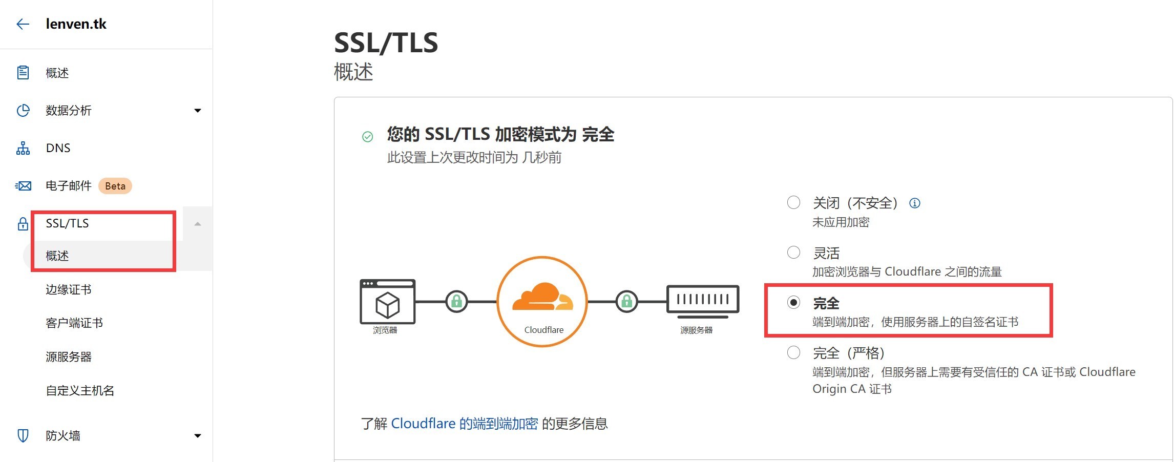 1、打开Cloudflare,配置SSL/TLS加密模式为完全。