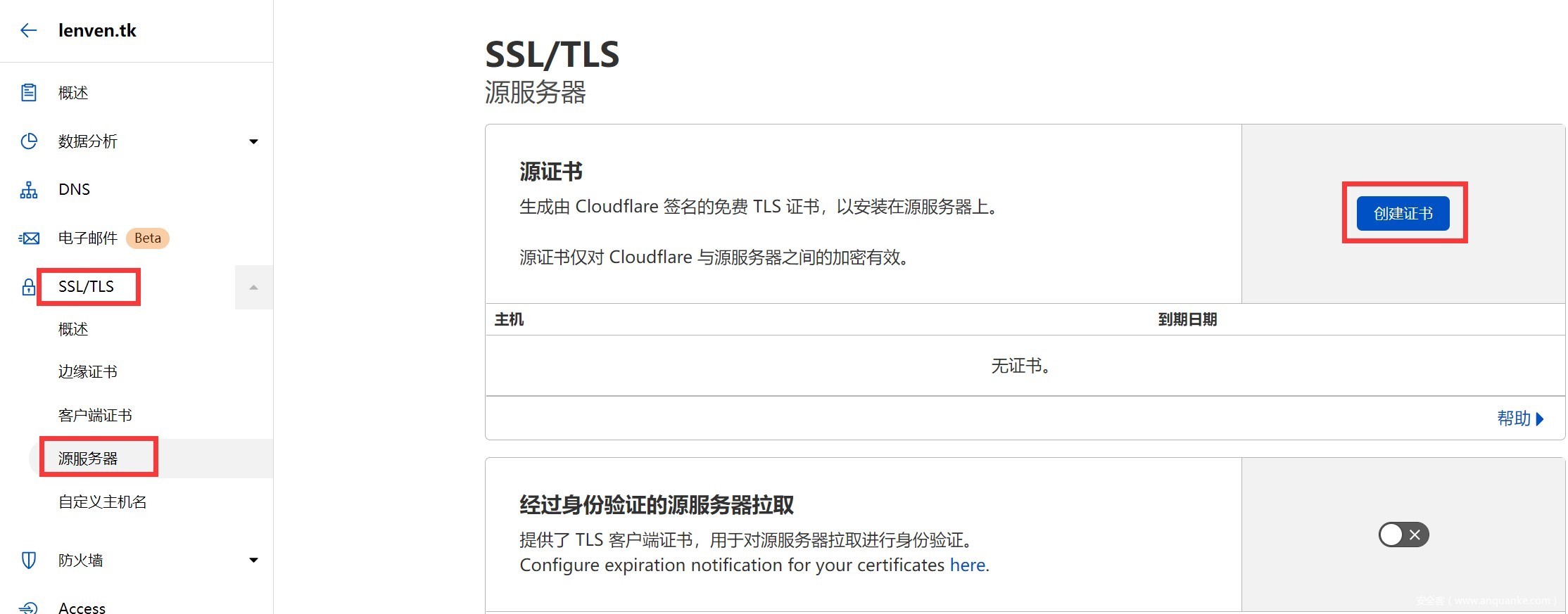 3、打开SSL/TLS的源服务器创建源证书。