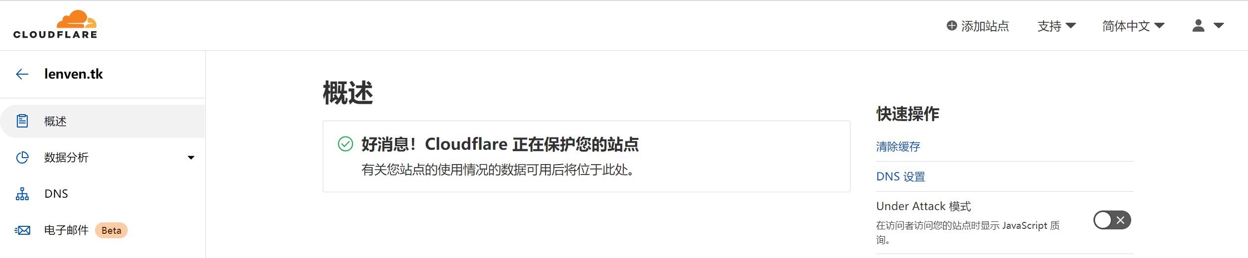7、概述显示“好消息!Cloudflare 正在保护您的站点”则配置成功。